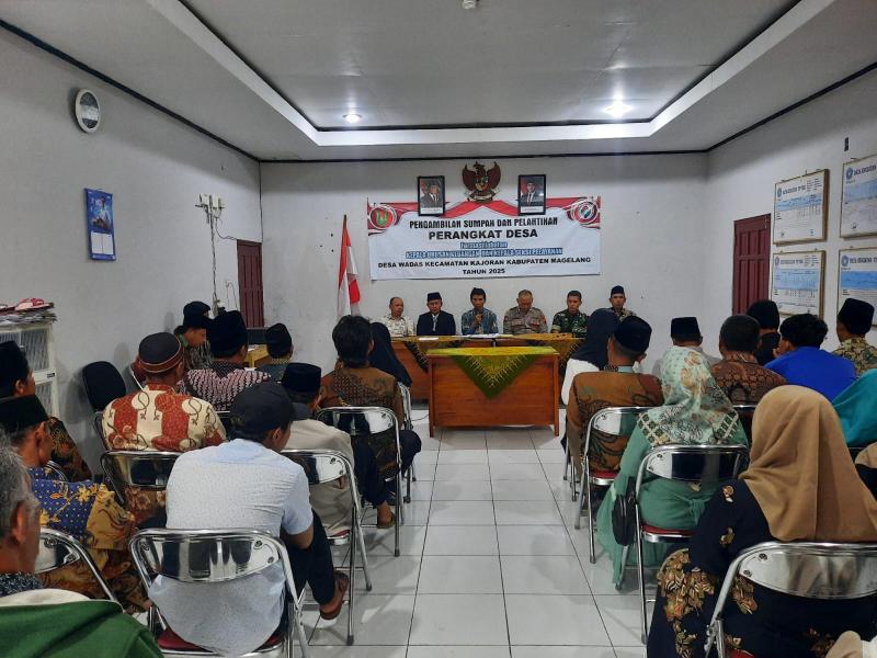 Acara Pengambilan Sumpah Janji dan Pelantikan Perangkat Desa pada Lingkungan Pemerintah Desa Wadas Kecamatan Kajoran Kabupaten Magelang pada Jum’at (29 Agustus 2025) dimulai pada pukul 09.30 WIB dan dihadiri oleh Camat Kajoran beserta Sekcam dan Kasi Tapem Kecamatan, Kapolsek Kajoran, Koramil Kajoran, BPD, Tokoh Masyarakat, Keluarga Perangkat Desa terpilih dan warga masyarakat lainnya.